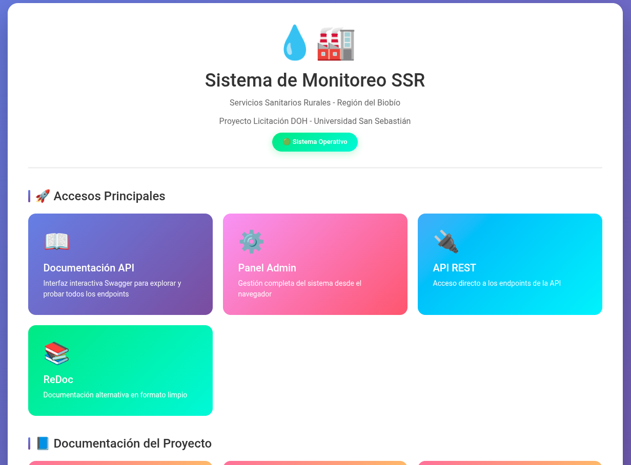 Plataforma de Monitoreo SSR - API Backend (para MOP/Ministerio de Obras Publicas) Sistema backend profesional desarrollado para el Ministerio de Obras Públicas (MOP) de Chile mediante licitación pública. API REST para el monitoreo de Sistemas de Servicios Sanitarios Rurales de la Región del Biobío, implementada para la Universidad San Sebastián como proyecto real en producción. Funcionalidades: Autenticación JWT para apps oficiales, monitoreo en tiempo real de infraestructura crítica, sistema de alertas automáticas para emergencias, gestión documental oficial y comunicación entre DOH y operadores certificados.