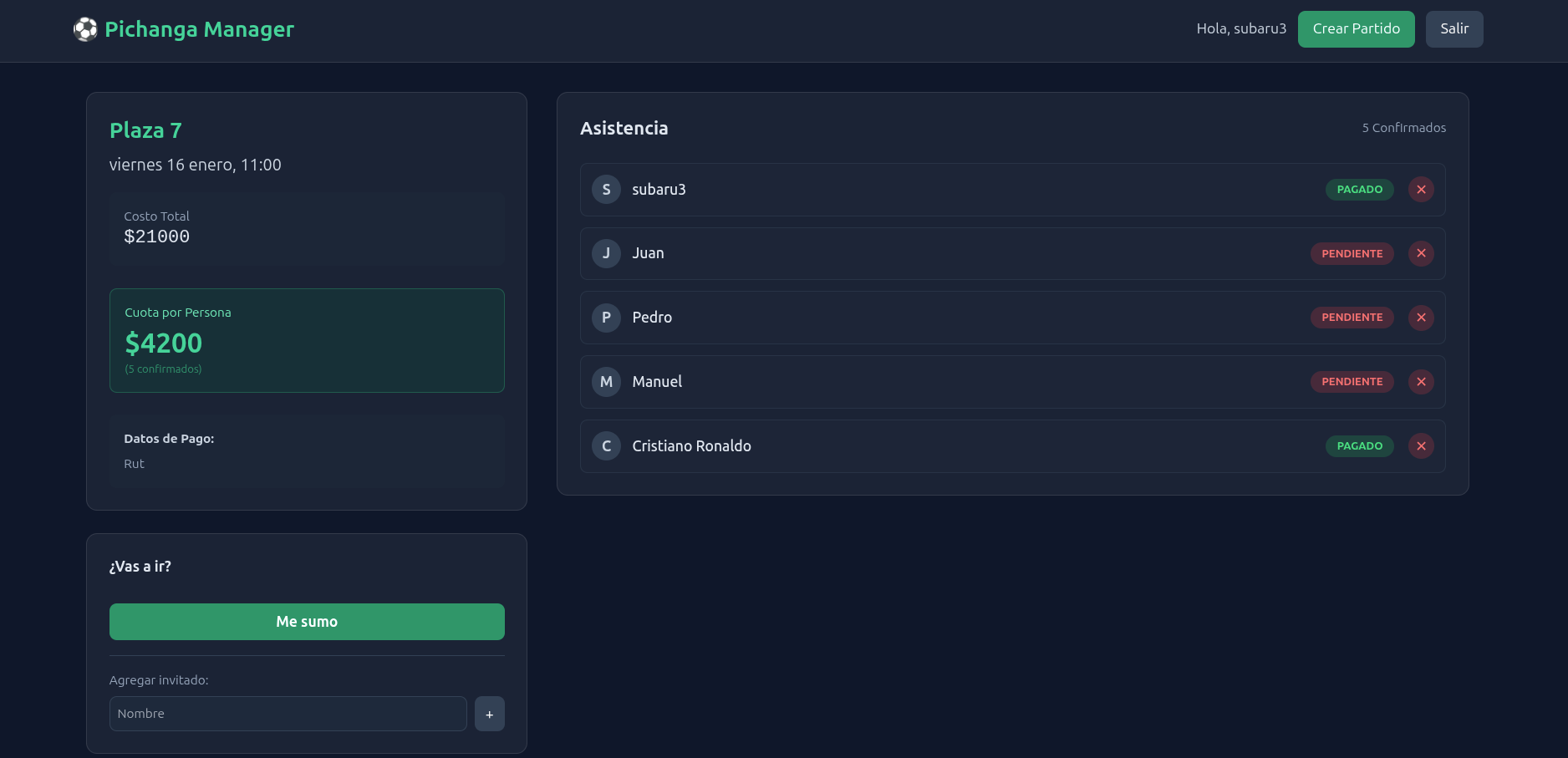 Pichangas Manager – Gestión de Encuentros de Fútbol Pichangas Manager es una aplicación web Fullstack desarrollada con Django para organizar partidos de fútbol casuales de forma simple y centralizada. La plataforma permite gestionar convocatorias, dividir gastos automáticamente, controlar pagos y generar equipos aleatorios, resolviendo los problemas más comunes al coordinar una pichanga entre amigos.
