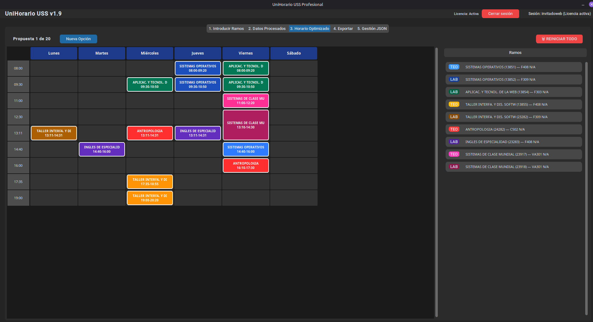 Credenciales de Prueba Usuario: invitado Contraseña: 1234invitado UniHorario es una herramienta de optimización de horarios académicos diseñada para estudiantes de la Universidad San Sebastián. Automatiza la toma de ramos generando combinaciones óptimas según preferencias personales, a partir de datos reales del portal USS. Proyecto fullstack, disponible como aplicación web y de escritorio. Características Clave Parser inteligente para datos crudos del portal USS (copiar y pegar). Asociación automática de ramos TEO/LAB. Generación de múltiples horarios realmente distintos. Filtros por preferencias (ventanas, horarios, sábados). Uso online (web) y offline (desktop .exe). Plataformas Desktop: Aplicación ejecutable para uso local y offline. Web: Interfaz moderna en navegador. Frontend React: Base preparada para evolución comercial. Proyecto orientado a resolución de problemas reales, con enfoque en automatización, optimización y diseño de software escalable prueba con: 13851 ICIF G002 T01 TEO SISTEMAS OPERATIVOS T1 L1 50 02-03-2026 11-07-2026 F408 1440 1600 F 177564524 LUCIANO RADRIGAN/FIGUEROA 13852 ICIF G002 T50 LAB SISTEMAS OPERATIVOS L1 T1 25 02-03-2026 11-07-2026 F309 0800 0920 R 177564524 LUCIANO RADRIGAN/FIGUEROA 13852 ICIF G002 T50 LAB SISTEMAS OPERATIVOS L1 T1 25 02-03-2026 11-07-2026 F309 0930 1050 R 177564524 LUCIANO RADRIGAN/FIGUEROA 23281 ICIF G002 T51 LAB SISTEMAS OPERATIVOS L1 T1 25 02-03-2026 11-07-2026 F301 0800 0920 S 177564524 LUCIANO RADRIGAN/FIGUEROA 23281 ICIF G002 T51 LAB SISTEMAS OPERATIVOS L1 T1 25 02-03-2026 11-07-2026 F301 0930 1050 S 177564524 LUCIANO RADRIGAN/FIGUEROA 13853 ICIF G003 T50 LAB APLICAC. Y TECNOL. DE LA WEB 30 02-03-2026 11-07-2026 F301 0800 0920 W 129205016 LEONARDO HERNANDEZ/VERA 13853 ICIF G003 T50 LAB APLICAC. Y TECNOL. DE LA WEB 30 02-03-2026 11-07-2026 F309 0800 0920 T 129205016 LEONARDO HERNANDEZ/VERA 13853 ICIF G003 T50 LAB APLICAC. Y TECNOL. DE LA WEB 30 02-03-2026 11-07-2026 F309 0930 1050 T 129205016 LEONARDO HERNANDEZ/VERA 13854 ICIF G003 T51 LAB APLICAC. Y TECNOL. DE LA WEB 25 02-03-2026 11-07-2026 F303 0930 1050 W 129205016 LEONARDO HERNANDEZ/VERA 13854 ICIF G003 T51 LAB APLICAC. Y TECNOL. DE LA WEB 25 02-03-2026 11-07-2026 F309 0800 0920 F 129205016 LEONARDO HERNANDEZ/VERA 13854 ICIF G003 T51 LAB APLICAC. Y TECNOL. DE LA WEB 25 02-03-2026 11-07-2026 F309 0930 1050 F 129205016 LEONARDO HERNANDEZ/VERA 13855 ICIF G004 T01 TEO TALLER INTERFA. Y DIS. SOFTW T1 L1 45 02-03-2026 11-07-2026 F408 1735 1855 W 117943747 SILVIA REYES/QUEZADA/ 13855 ICIF G004 T01 TEO TALLER INTERFA. Y DIS. SOFTW T1 L1 45 02-03-2026 11-07-2026 F408 1900 2020 W 117943747 SILVIA REYES/QUEZADA/ 13867 ICIF G004 T50 LAB TALLER INTERFA. Y DIS. SOFTW L1 T1 25 02-03-2026 11-07-2026 F303 1100 1220 M 231319948 ELIZABETH CHICATA/CASTRO 23282 ICIF G004 T51 LAB TALLER INTERFA. Y DIS. SOFTW L1 T1 20 02-03-2026 11-07-2026 F309 1311 1431 M 231319948 ELIZABETH CHICATA/CASTRO 24282 FORI 0001 T47 TEO ANTROPOLOGIA 60 02-03-2026 11-07-2026 C502 1610 1730 F 104472192 SANDRA GAJARDO/SALDÍAS 24282 FORI 0001 T47 TEO ANTROPOLOGIA 60 02-03-2026 11-07-2026 C509 1311 1431 W 104472192 SANDRA GAJARDO/SALDÍAS 13856 ICIF G005 T50 LAB INGLES DE ESPECIALIDAD 20 02-03-2026 11-07-2026 F408 1440 1600 R 163488124 FELIPE BENAVENTE/ULLOA 13856 ICIF G005 T50 LAB INGLES DE ESPECIALIDAD 20 02-03-2026 11-07-2026 F503 1311 1431 T 163488124 FELIPE BENAVENTE/ULLOA 23283 ICIF G005 T51 LAB INGLES DE ESPECIALIDAD 20 02-03-2026 11-07-2026 F408 1311 1431 R 163488124 FELIPE BENAVENTE/ULLOA 23283 ICIF G005 T51 LAB INGLES DE ESPECIALIDAD 20 02-03-2026 11-07-2026 F408 1440 1600 T 163488124 FELIPE BENAVENTE/ULLOA 23288 ICIF I004 T01 TEO MINERIA DE DATOS Y BIG DATA T1 L1 28 02-03-2026 11-07-2026 B410 1735 1855 R 18107163K BLAS MARDONES/ZAMBRANO/ 23288 ICIF I004 T01 TEO MINERIA DE DATOS Y BIG DATA T1 L1 28 02-03-2026 11-07-2026 B410 1900 2020 R 18107163K BLAS MARDONES/ZAMBRANO/ 23289 ICIF I004 T50 LAB MINERIA DE DATOS Y BIG DATA L1 T1 28 02-03-2026 11-07-2026 F309 1100 1220 T 231319948 ELIZABETH CHICATA/CASTRO 23289 ICIF I004 T50 LAB MINERIA DE DATOS Y BIG DATA L1 T1 28 02-03-2026 11-07-2026 F309 1440 1600 M 231319948 ELIZABETH CHICATA/CASTRO 23289 ICIF I004 T50 LAB MINERIA DE DATOS Y BIG DATA L1 T1 28 02-03-2026 11-07-2026 F309 1610 1730 M 231319948 ELIZABETH CHICATA/CASTRO 14492 ICIF 1042 T01 TEO TALLER SOFTWARE DATA SCIENCE T1 L1 40 02-03-2026 11-07-2026 VC302 1735 1855 F 231319948 ELIZABETH CHICATA/CASTRO 14493 ICIF 1042 T50 LAB TALLER SOFTWARE DATA SCIENCE L1 T1 40 02-03-2026 11-07-2026 VC302 1900 2020 F 231319948 ELIZABETH CHICATA/CASTRO 23917 ICIF 1039 T01 TEO SISTEMAS DE CLASE MUNDIAL T1 L1 40 02-03-2026 11-07-2026 VA301 1100 1220 F 13034349K HUGO GUTIERREZ/FIGUEROA 23918 ICIF 1039 T50 LAB SISTEMAS DE CLASE MUNDIAL L1 T1 40 02-03-2026 11-07-2026 VA301 1310 1430 F 13034349K HUGO GUTIERREZ/FIGUEROA
